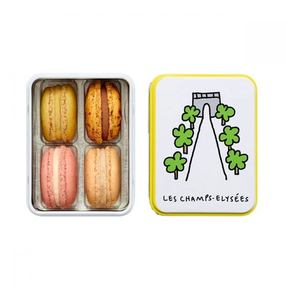 The trio consists of three metal boxes, each containing four assorted makarons.